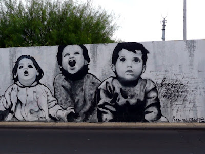 Mientras se realizaban obras de rehabilitación. en el Parque Cultural Viera y Clavijo, de la capital tinerfeña, se colocó exteriormente una valla de chapa galvanizada, que ha servido como muro "oficial" de grafiteros. Aun cuando las obras se han eternizado, ya ha desaparecido la valla hacia la Rambla, y con ella algunos murales, como este... de los tres menores, que clamaban sus reivindicaciones inocentes: ¡¡